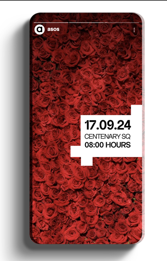 At the busy city location, a transparent box is filled with rose petals, and a timer counts down until the release of teh collection. In a dramatic moment, the sheet of petals disappear as a model is revealed wearing an iconic outfit from The ASOS Rose Collection.. A QR code on the box invites spectators exclusive access to ‘Shop The Drop’, while the entire moment provides conent for social.