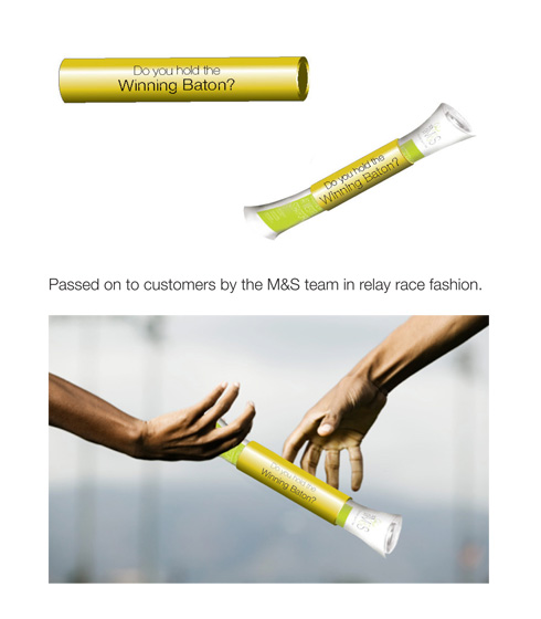 To spread the word, members of 'Team M&S' in full uniform would be on the street running up to the public to pass on the store magazine in relay race fashion. The winning baton referred to the many prizes to be won.